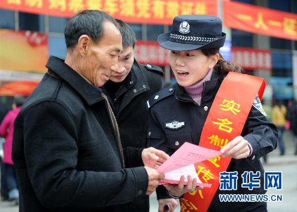 1月17日,一位民警在為旅客解答實名制售票的相關問題。連日來,南昌鐵路民警組織宣傳小分隊在南昌火車站售票大廳、候車室、進站口等多處為旅客發放宣傳冊和溫馨提示卡片,介紹實名制售票流程及相關問題,幫助旅客答疑解惑,確保春運期間后實名制售票工作得以順利進行。2月5日至27日,南昌火車站將試行火車票實名制售票。新華社記者周科攝