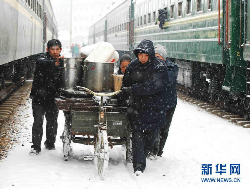 1月18日,在江西九江市鐵路客技站,工作人員冒雪為客車運送餐料食品。 當日,一場大雪突降江西九江,贛北大地銀裝素裹。九江地區鐵路部門冒雪對車輛進行防斷檢修和餐車食品供應工作,確保1月19日春運順利啟動。 新華社發(胡國林 攝)