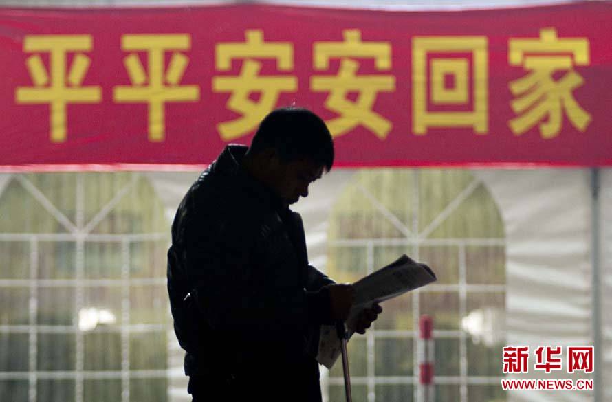 1月19日,一名旅客在浙江杭州城站火車站臨時候車大廳瀏覽報紙,等候列車。2011年春運自當日開始至2月27日結束,為期40天。新華社發