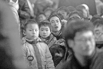 17日,濟(jì)南火車(chē)站,一名男子和幾個(gè)孩子等待上車(chē)。 本報(bào)記者 王媛 攝