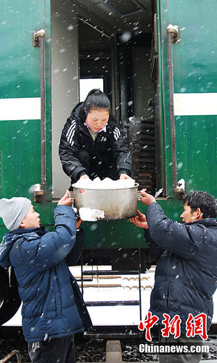 1月18日,一場大雪突降江西九江等地,江西贛北地區大雪紛飛,一片銀白,江西境內的鐵路部門做好車輛防斷檢修和餐車食品供應工作,確保人們出行安全暢通。圖為工作人員正在風雪中往客車上運送餐料食品。胡國林 攝