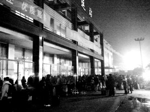 凌晨4時,記者趕到宏基長途客運站,站內候車室、售票大廳燈火通明,里面卻是空蕩蕩的;站外卻是一片黑壓壓人群,大約有一千多人。在寒風中被車站拒之門外,他們和陶輝一樣,已經挨凍等了一個多小時,最長的等了近3個小時。