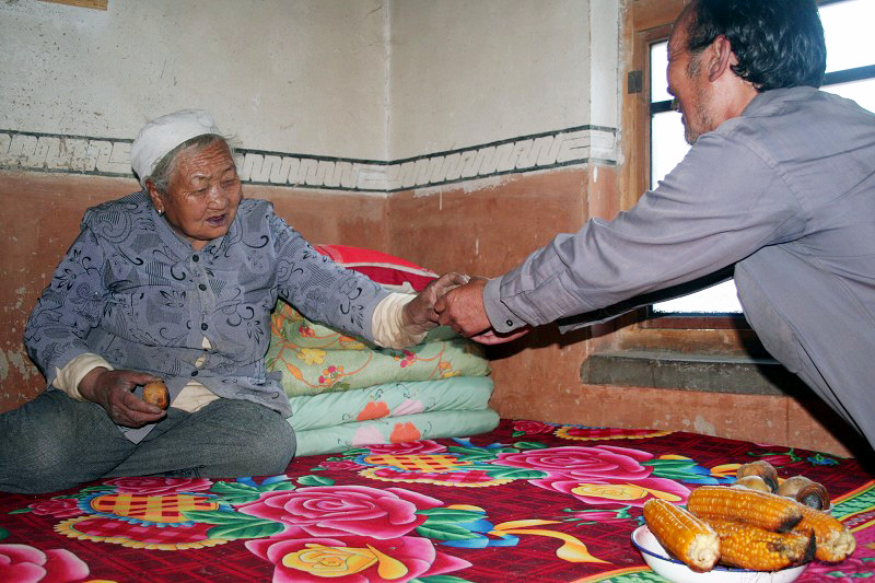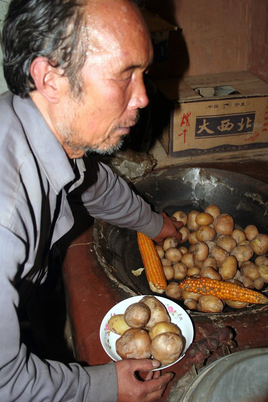 李國峰給母親遞土豆吃。(資料圖片)