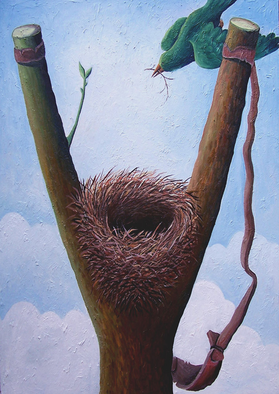 鳥在萌芽的彈弓叉上筑巢——人們不再用彈弓打鳥,將木制彈弓叉栽植在地上生根發(fā)芽,呼喚環(huán)保愛護鳥類。