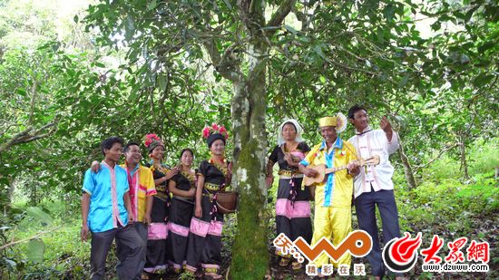 布朗族男女在一起唱情歌,中間是老曼峨村一千三百多年的老茶樹。