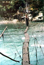 在歷史上,獨(dú)龍江的路,是掛在絕壁上的天梯,懸在江面上的藤篾溜索和吊橋,是斷斷續(xù)續(xù)的延伸在江邊的羊腸鳥道 。對于生活在現(xiàn)代社會的人來說,這條"路"有如天方夜譚,那是人類道路史上的一人奇跡。千百年來,獨(dú)龍人就生活在其間。大自然僅為他們提供了最低限度的、最初始的生存條件,他們的一切生活方式、生存宗旨都是在圍繞著創(chuàng)造最基本的保障而努力。獨(dú)龍人就是在如此艱難的自然環(huán)境中形成了自己獨(dú)特的生活格局。