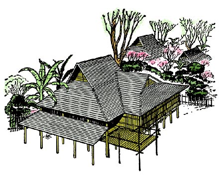 傣族竹樓是一種干欄式住宅。云南西雙版納是傣族聚居地區,這里的地形高差變化較大,北部為山地,東部為高原,西部卻為平原。全區氣候差別也大,山地海拔達1700米,屬溫帶氣候;平原海拔750-900米,屬亞熱帶氣候;有的河谷平原,海拔只有500米,已經屬于熱帶氣候了。傣族人民多居住在平壩地區,常年無雪,雨量充沛,年平均溫度達21℃,沒有四季的區分。所以在這里,干欄式建筑是很合適的形式。