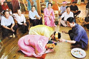 成婚儀式在新娘家舉行,屆時要殺豬、殺雞(有的人家還宰牛),備辦豐盛的酒席宴請親朋好友和本寨父老鄉(xiāng)親。舉行婚禮之日,在新娘家堂屋內設置“茂歡”(直譯為魂桌),擺上一至三張蔑桌,用芭蕉葉鋪面,上擺煮熟的雌雄子雞一對,和用芭蕉葉盛裝的糯米飯以及米酒、舂鹽棒、食鹽、芭蕉、紅布、白布、白線等物。雌雄子雞需用傣語稱為“索累東”的芭蕉葉做成的葉帽罩蓋。作好舉行婚禮的準備后,新娘的女友,要陪伴新娘梳洗打扮,等待新郎登門。新郎亦在家中梳洗更衣,在親朋好友陪同下,到新娘的竹樓上舉行結婚儀式。