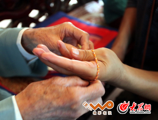 老州長為小記者施哲瑩拴線。拴線是版納傣族人至高的一種禮節,包含所有美好的祝福