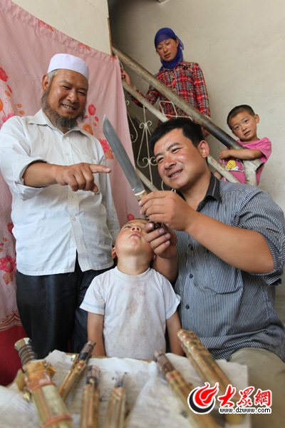 馬維雄和兒子馬尕住麻查看剛打造出來的腰刀。
