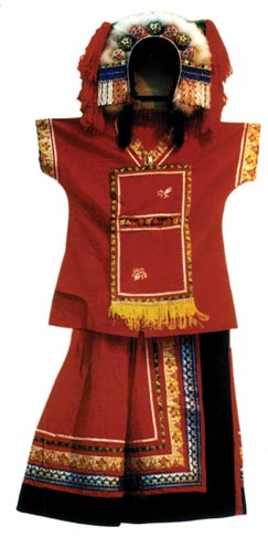 2、以布農、魯凱和排灣人為主的長衣下裳式:其特點為上身穿窄袖上衣,在袖與肩的部位有滾邊的刺繡,下穿圍裙膝褲,以黑布或紅布纏頭,跣足。