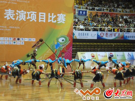 高榮華帶隊(duì)在第九屆少數(shù)民族運(yùn)動會上表演高山族舞蹈現(xiàn)場。