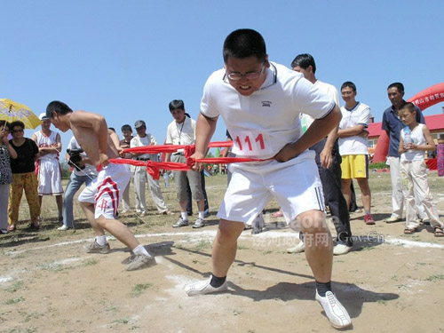 魚王角力:比賽二人背向站立,將一條約五米長的綢布兩頭結(jié)牢后套于腹部用力拉拽,觸及前方標(biāo)志線或標(biāo)志物者為勝。