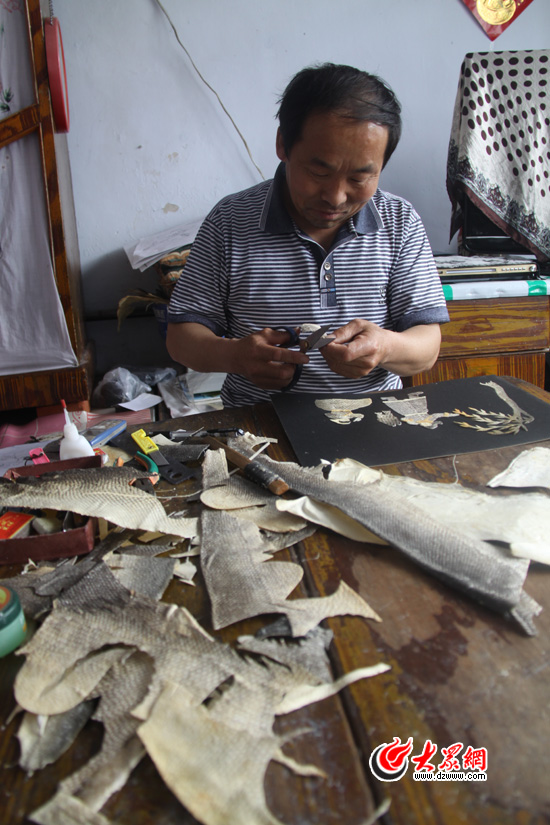 除了魚皮畫,孫玉林店里還有用魚皮裝飾的小鏡子、手機掛鏈、車飾掛鏈等等應時的小飾品,孫玉林說靠賣這些東西一年里可以多收入一兩萬塊錢。