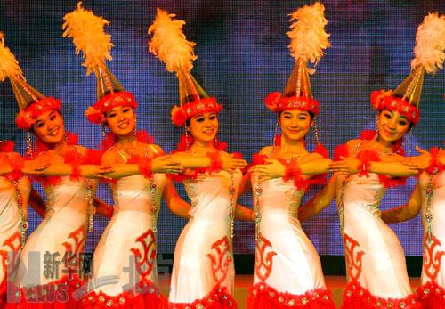 中央民族歌舞團在北京大紅門國際服裝節和諧華夏民族服裝展演會上表演哈薩克族女子舞蹈。 新華社記者王呈選攝