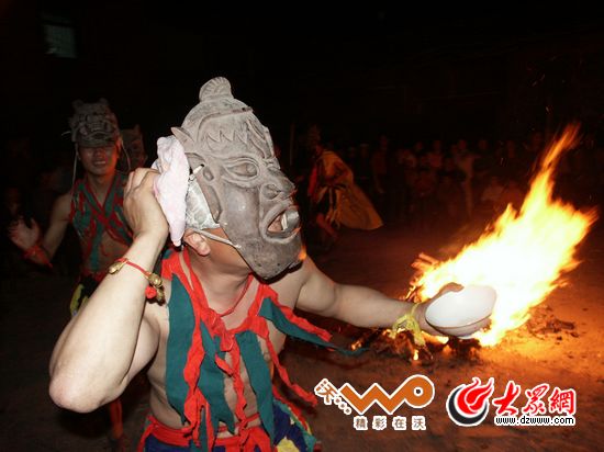屯堡大漢族的祭祀儀式上的儺面舞蹈。據(jù)說儺戲是從軍儺演變來的(施曉亮攝)