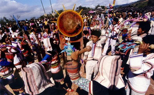 二是在"特懋克"(即"打鐵節")時。過"打鐵節"的日子,是由寨子中的七位長老決定的,一旦時間確定,卓巴就把置放在家中的神圣的大鼓掛起來,寨民們就知道"打鐵節"開始了。這一天要選出一個后補鐵匠,新選出的鐵匠不一定很會打鐵,而是一位18歲左右的"帥哥",有點選美的意思。新選出的鐵匠倍受尊敬,當晚舉行祭鼓儀式。跳大鼓舞時,人們先在卓巴家前搭一祭臺,祭臺頂用竹篾彎扎成一道"彩虹",臺中畫有一幅"洪水故事"中的大鼓,在洪水圖畫前放置一面舞蹈用的大鼓。新鐵匠則坐在墊有氈子的竹篾凳上。舞蹈開始,按慣例由大長老卓巴先向大鼓祭酒,后擊鼓舞蹈,依次是二長老卓生,在七老和首席鐵匠祭鼓舞蹈后,新鐵匠必須擊鼓而舞。"打鐵節"跳大鼓舞,除表現出基諾族對祖先的崇敬外,還表現了基諾人由原始石器時代的采集、狩獵向鐵器時期刀耕火種的農耕時代的轉變。