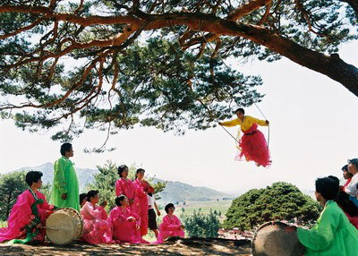 蕩秋千:也叫“打秋千”,是朝鮮族傳統(tǒng)體育項目,多在元宵、端午和中秋節(jié)舉行。尤其受到婦女們的喜愛,并經常進行該項目的比賽。比賽時評定優(yōu)勝者有幾種方法:一種是以秋千架前方高樹上的樹葉或花朵為目標,用腳碰著或咬掉樹葉(花朵)者為勝;一種是在踏板底下掛一根長繩,測量秋千蕩起的高度,高者為勝;還有一種是在秋千架前方豎兩根樹桿,桿上橫拉一根系有鈴鐺的繩子,蕩秋千者以碰鈴次數(shù)多少決定勝負。