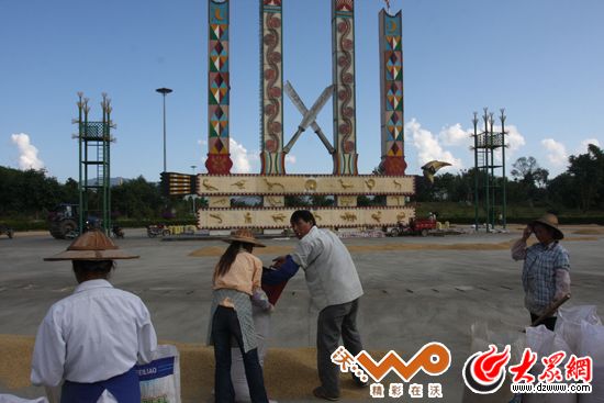 隴川縣城里的“景頗風情廣場”。正值秋收,這里成了百姓曬糧食的好地方。