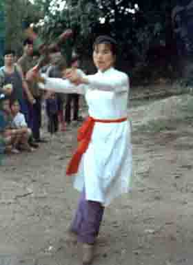 在“哈節”最后一項禮儀“宰豬大祭”剛剛結束,哈亭內焚燒祭文的青煙還未散盡,已從遠遠村口處傳來大木鼓沉重而轟鳴的咚咚聲,使所有的京族民眾都向著村口涌去。被人們團團圍住的參天榕樹下,一位身著白色長衫、紫色發帶,雙手持長約40公分、纏繞彩色花帶、具有驅魔神力花棍的窈窕少女,已在聞鼓起舞。