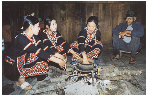 烤茶:是拉祜族一種古老而普遍的飲茶方法。先將陶罐在火塘上烤熱,后放入茶葉進(jìn)行抖烤,待茶色焦黃時,沖入開水,去掉浮沫再加入開水。待茶煮好后,主人先倒少許茶水自嘗,以試其濃度,如茶汁過濃,可加入開水使之濃淡相適,然后再倒給客人飲用。這種烤茶香氣很足,味道濃烈,飲后精神倍增,心情愉快。