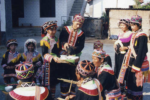 糟茶:也是拉祜族一種非常古樸而又簡便的飲茶方法。將鮮嫩茶葉采下后,加水在鍋中煮至半熟,取出置于竹筒內(nèi)存放,飲用時,取少許放在開水中再煮片刻,即倒入茶盅飲用。糟茶茶水略有苦澀酸味,飯后飲用有解渴開胃的功能,風(fēng)味特別。
