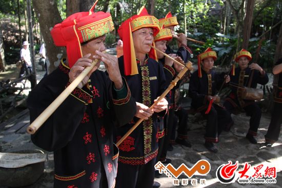 海南保亭的檳榔谷中還有一只演奏黎族竹木樂器的演奏隊,樂手全是周邊村寨的黎族村民。