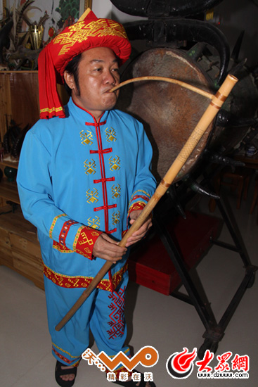 黃照安為記者吹奏黎族獨有的竹木樂器唎咧。