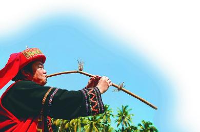 每當(dāng)夜幕降臨,寂靜的黎寨里,不時傳來陣陣的纖細(xì)而清幽的簫聲,這是黎家小伙子在吹簫召喚女友,或是姑娘以簫聲回答男友。以前黎家青年男女都會吹奏鼻簫,而所吹的鼻簫,一般多為即興吹奏,其曲調(diào)也因人而異。難怪黎族姑娘可以根據(jù)樂曲和音色的不同,能夠在很多的簫聲中辨認(rèn)出自己戀人那獨(dú)特的簫聲來。“拋個石頭探水深,吹曲鼻簫試儂心”。從這句黎族情歌中可看出,鼻簫與黎族青年的戀愛生活有著密切關(guān)系。(記者于偉慧/文李幸璜/圖)