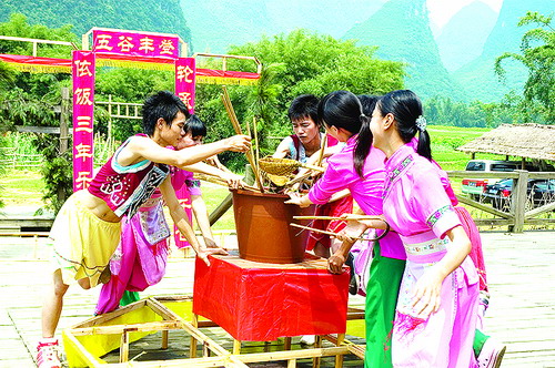 “搶糍粑”是仫佬族最興高采烈的活動,他們?nèi)藶橐弧岸保ńM),共三“冬”人輪番用長筷子去搶放在瓦缸里的三角粽,但是三個人只能共用三只腳著地,全靠手拉手、腳扣腳在蹦跳中保持平衡,一不小心失了平衡,搶到的粽子也會掉下地。一時之間滿場喝彩吶喊和擊鼓助威聲不絕,直到缸里的粽粑搶完為止,搶得粽粑最多的一“冬”為勝者。三角粽是仫佬族依飯節(jié)的吉祥物,仫佬族人相信,誰搶得多,得“福”也越多。
