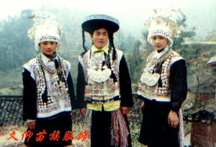 [提要] 久仰服飾是縣境苗族服裝中較為樸素的一種。男子包頭帕,帕寬16至20厘米,長4.2至5米,折疊成5厘米寬,裹成圓盤狀,如戴一個小斗笠,頭巾兩端有23至26厘米的穗子,編結為網狀,其后插入小鮮花數枝。衣裙用自織自染藏青色布縫制,為無領右衽大襟衣,無刺繡,不滾邊。