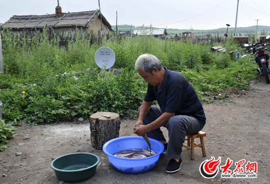 鄂英祥老人在院子里殺魚招待采訪團一行