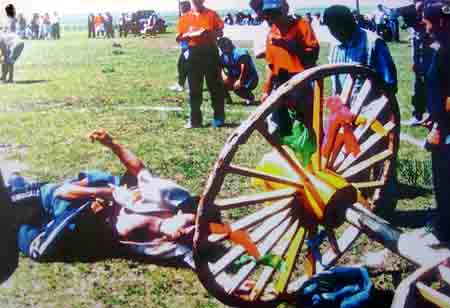 馱背,達(dá)斡爾語稱為“特莫阿特貝”,即像駱駝一樣馱物之意。參賽運(yùn)動(dòng)員要將衣袖、褲腿挽好或穿運(yùn)動(dòng)衣以防絆腿,然后平臥在平地上。自選或由裁判員指定兩名體重大致相同的年輕人,腿部以下相對(duì)橫壓在參賽者腰部,同參賽者組成十字形,隨著裁判員的下令,參賽者靠四肢和腰部的力量,將背上的兩人馱起。然后腿部立直,身體向前平伸,停立兩三分鐘為勝,如果馱不起或背上的人倒地為失敗。