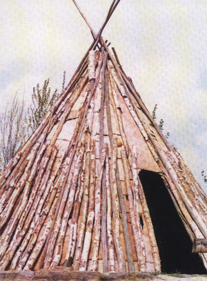 斜人柱的搭建十分簡單:先用幾根頂端帶枝杈、能夠相互咬合的木桿支成一個傾斜度約60度的圓錐形架子,然后將其它木桿均勻地搭在這幾根主架之間,使之形成一個傘狀的骨架。上面再覆蓋上狍皮或樺樹皮,一架夏可防雨,冬能御寒的“斜人柱”就建成了。斜人柱的頂端要留有空隙,以便里面生火時通風出煙,又可采光。南側或東南還要留出一個讓人出進的門。