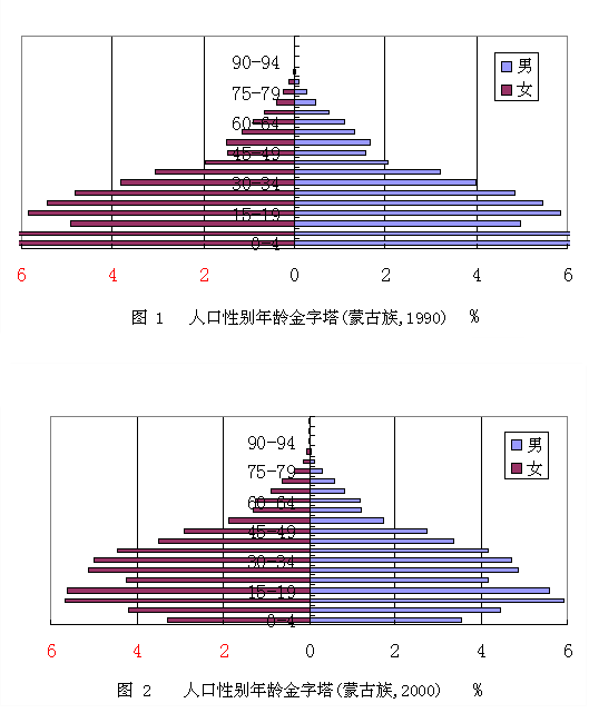 從各年齡段的人口比例看,少年兒童人口(0-14歲)比重為 27.03%,勞動年齡人口(15-64歲)比重為69.01%,老年人口(65歲及以上)占3.96%,與1990年相比,少年兒童人口比重下降了8.79個百分點,勞動年齡人口比重和老年人口比重分別增加了7.92和0.87個百分點。1990年和2000年蒙古族人口的性別年齡結構如圖1和圖2所示。