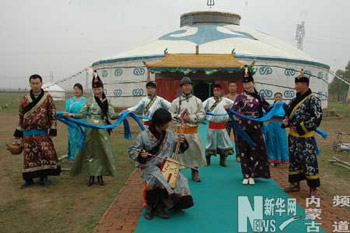 內蒙古正藍旗一家牧民開辦的旅游點上,身著盛裝的蒙古族姑娘、小伙子手捧哈達、美酒迎接遠方的客人。(布和朝魯 攝)