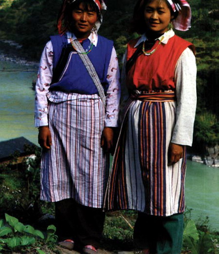 阿龍和若柔支系的女裝均有腰飾。其中,若柔支系因長期和白族共處雜居,故服飾基本上和蘭坪白族相同。阿龍支系則由于受藏文化影響較深,其女性服飾和藏族女裝有部分相似之處。阿龍婦女一般內(nèi)穿長及小腿的淺色上衣,外著長及臀部的深色領(lǐng)褂,腰系幾乎拖地的豎條彩花圍腰,而寬約3寸的腰帶則為彩色橫條花紋,在整個服飾濃淡深淺的色彩對比中起到畫龍點(diǎn)睛的效果,胸飾一般采用彩色串珠項(xiàng)鏈,頭飾則為紅白相間的纓穗。