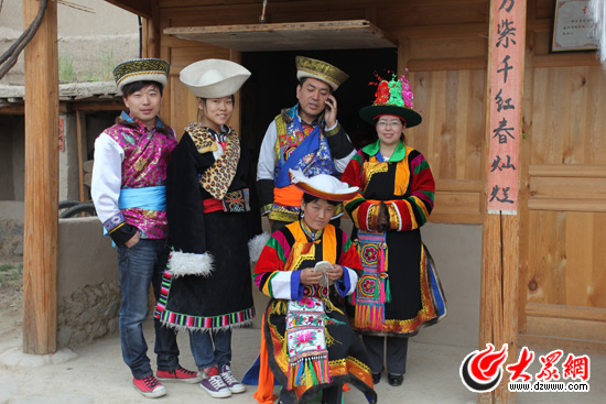 小記者在采訪土族阿姑。戴眼鏡的阿姑名叫喬領兄,26歲,大學畢業后還未找到工作,就先到“彩虹部落”跟董思明展示土族婚禮。她說她現在喜歡這份工作了。
