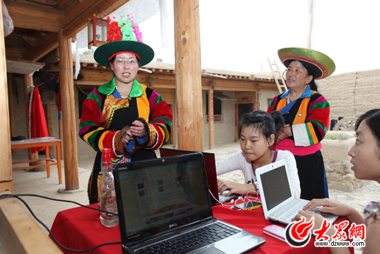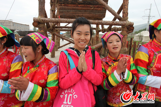 大眾網特約小記者施哲瑩與土族阿姑們。