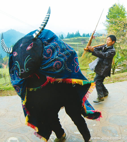 [提要] 少數民族“斗角舞”:又叫“斗牛舞”,相傳遠在明朝初年,水族祖先看到苗族有斗牛“吃牯臟”祭祖的場面,既熱鬧又隆重。斗角舞對耕牛嬉戲、打鬧的形象化表達,正是表現了水族人對牛的感情,實際也是一種耕作文明的體現。