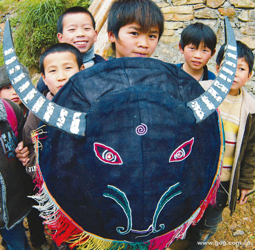 自己縫制的牛角是斗角舞最關鍵的道具。頭頂牛角,穿上黑色的披風,伴著蘆笙節奏,邊舞邊斗,猶如水牛在田中玩鬧、打架,動作剛健英武。因此,這里的水族人形容這個舞蹈,一般都形象地說“打得精彩”。雖然這是祖輩傳下來的舞蹈,但也不是人人都能學的,按韋支書的說法:一要受得了累,二要懂點技巧。村里會“斗角”的也就40多人,但是“打得精彩”都是年輕人。如今,年輕人大都外出打工了,也只有過春節的時候寨子里斗得最熱鬧。