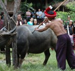 11月28日當主持人宣布“鏢牛祭拜司崗里開始”時,佤族群眾便吹響牛角號、敲響大木鼓。鏢牛結束后,用牛頭祭木鼓和司崗里。牛被鏢倒 安排人員剖開牛腹,取出內臟,......