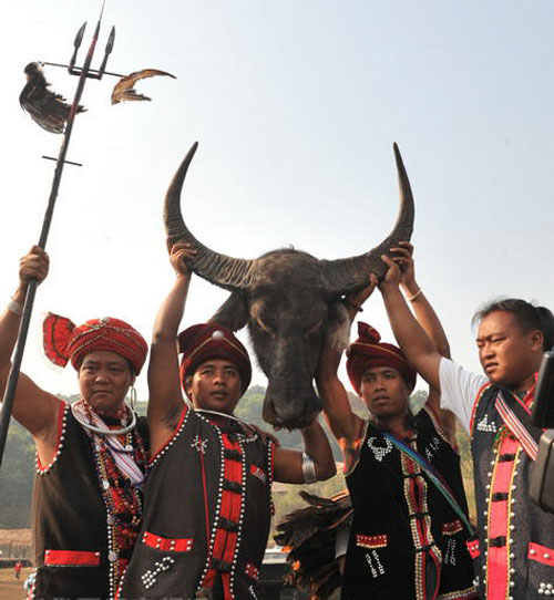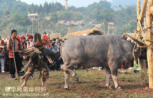 后來,由于水牛與人類(佤族)有著十分密切的關系,水牛在生產生活中給予人類(佤族)較大貢獻。于是佤族就把水牛當作了自己的吉祥物,去崇拜它。由于水牛的價格比較昂貴,絕大多數人家都沒有能力購買,更談不上舉行鏢牛活動了。所以,牛頭就成了財富的象征。當舉行重大活動時或者當部落與部落之間解決矛盾和糾紛時,就把水牛作為慶祝活動最好的吉祥物,都要舉行盛大的鏢牛活動,并請村寨里比較有威望的頭人,選好供奉水牛頭的地方,把水牛的頭好好地保存起來,這就是所謂的“龍摩爺”(佤語:意為供奉牛頭的圣地)