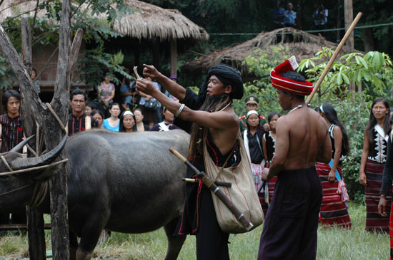 鏢牛儀式既莊嚴又神秘。所用的水牛經(jīng)過挑選,都是強壯的黑色公牛,一是佤族崇拜黑色,二是祭祀用的必須是水牛頭。在他們看來,大角牛頭是神圣之物,是財富地位的象征,是供奉神靈的祭品。拴牛儀式開始,低沉悲壯的牛角號奏響、大木鼓敲起。副鏢手帶領(lǐng)佤族男子將兩頭牛牽到牛樁前用繩子拴好,然后互相巧妙配合,拋繩哄牛,既要用繩子把牛蹄栓住,又要躲避它防止被牛踢傷。緊接著,主持人宣布“請頭人向鏢手授鏢槍”,鏢牛手在魔巴的帶領(lǐng)下走向前,接受鏢槍和敬酒,左手持鏢槍,右手拿杯喝干敬酒,在魔巴帶領(lǐng)下返回鏢牛場,鑼鼓歌舞隊更加熱烈地敲鑼打鼓、載歌載舞。緊接著,主持人宣布“請頭人向鏢手授鏢槍”,鏢牛手在魔巴的帶領(lǐng)下走向前,接受鏢槍和敬酒,左手持鏢槍,右手拿杯喝干敬酒,在魔巴帶領(lǐng)下返回鏢牛場,鑼鼓歌舞隊更加熱烈地敲鑼打鼓、載歌載舞。