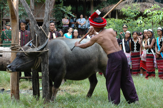 [提要] 當主持人宣布“鏢牛祭拜司崗里開始”時,佤族群眾便吹響牛角號、敲響大木鼓。鏢牛結(jié)束后,用牛頭祭木鼓和司崗里。牛被鏢倒 安排人員剖開牛腹,取出內(nèi)臟,分割牛肉,參加活動的見者有份