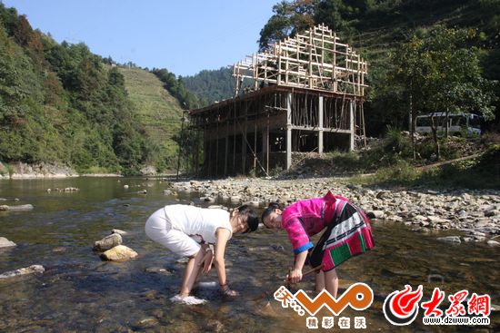 潘永艷與小記者瑩瑩在家門前的金江里捉魚,身后是她舅舅家正在起的木房。