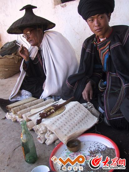 在彝族族群里,畢摩是最具有文化的、德高望重的長老,他掌握著這個民族的歷史、文化、習俗,大到一個社群、族群的祭祀,小到一個家庭的占卜,都要恭請畢摩;日常生活中包括婚喪嫁娶、紅白喜事、蓋房子、驅鬼治病等諸事,也都要恭請畢摩來解決。畢摩地位的高低并不是論資排輩,不是世襲,而是憑借學問和家傳,能夠成為畢摩的頭頭,就是大畢摩。“阿余家”的阿余洋架在成為彝族的大畢摩的時候,才20多歲,據(jù)他的弟弟說,能成為大畢摩并不僅僅是一個名分,而是在一點一滴,每一家一家的給別人做法事,這么多的彝族的百姓都中口稱贊的時候,這個人的威望才慢慢慢慢的樹立起來。