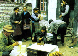 每逢早、晚,婦女們把濾凈的鮮奶倒入酥油桶里,使之略微發(fā)酵,如發(fā)酵差,可加些溫水。打酥油通常由一位婦女承擔,遇體弱多病或年老體衰者,也有兩人同時操作的。打酥油時,兩手握住木柄,用腰、臂以至全身力氣,壓“甲洛” 下沉,觸及桶底;旋松手,任憑浮力又將其緩緩托起。如此周而復始,反復近千次,酥油才從奶中分離,浮于表層。這時,操作者精心、仔細地把酥油撈起,把粘在桶壁上的油點粘出,一并放入盛涼水的大盆里。在涼水中用兩手反復捏、攥,直至將酥油團中的雜質(zhì)——脫脂奶除凈為止。人們習慣將酥油拍成扁圓或方形的坨團。夏季一桶奶能打出酥油3—5斤。待酥油坨積多時,男人們將其揣進泡軟了的小牛皮或牛羊肚兒中,縫好,以便于保存和運輸。