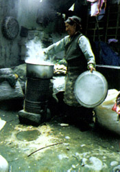 [提要] 糌粑、酥油、茶葉還有牛羊肉,被稱為西藏飲食的“四寶”。糌粑像炒面,但不是炒面,是由一種炒熟的青稞粒磨制而成。炒青稞的灶是土坯砌成的,呈“串”字形,一排3、4個灶孔,灶孔大小、形狀與炒鍋等。