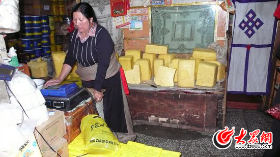 酥油。前面成袋的是佛事點燈用的燈油;后面象一塊塊豆腐一樣切著賣的是老百姓的食用酥油。